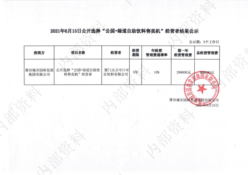 2021年6月15日公开选择“公园•绿道自助饮料售卖机”经营者结果公示