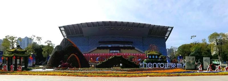 体育中心综合馆前广场迎春花坛占地面积约800平方米,高6.8米,长28米,宽30米。
