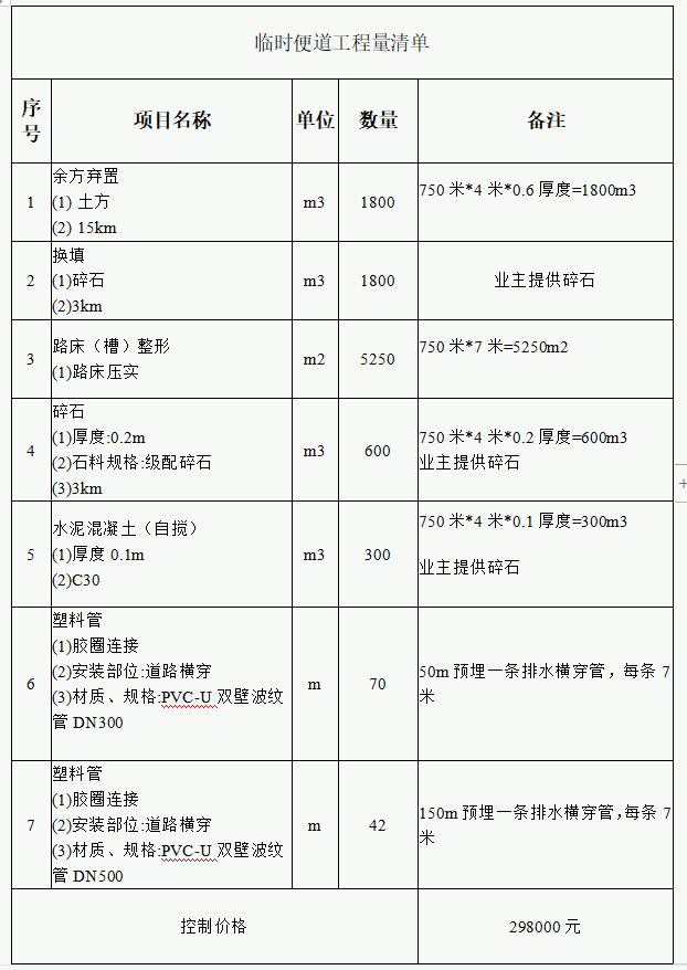 临时便道项目施工班组招标公告因项目建设需要,现以报价方式确定临时便道项目的施工班组单位,请按要求将报价单盖章后提交至禁忌书屋 招标采购网。 一、项目概况和施工范围 1.建设地点:莆田市绶溪公园游客服务中心后(具体施工范围以现场勘察为主); 2.工程建设规模:总长约750米,宽度约4米。 3.招标内容:临时便道路床(槽)整形宽度约7米,其中4米宽便道需基础开挖深度60公分并用碎石(碎石甲供)换填及压实,开挖土方由施工班组负责外运弃置,临时便道灌注混凝土做法:铺设20公分的级配碎石(碎石甲供)铺垫并压实,再铺设10公分厚C30水泥混凝土(自搅,碎石甲供),水泥路面需割缝及养护一个星期,需预埋排水横穿管及雨水口施工,具体做法详见清单。 注:本项目除碎石由业主提供(运输由施工班组自行负责),其他材料及人工机械等由施工班组提供。 ![]() 4.临时便道做法: